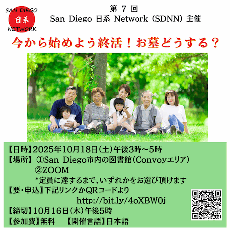 講師には、サンディエゴで葬儀や火葬のサービスを行っているRandy Bellamyさん (Balboa Cremation Service)と、終活カウンセラーの増田修士さんをお迎えします。